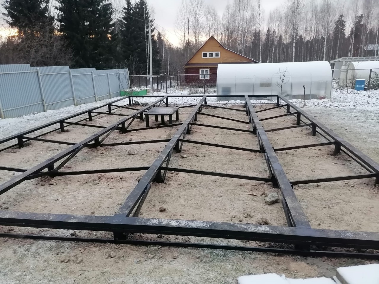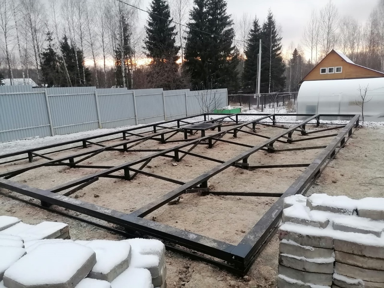 Фундамента на сваях в зимний период - 40 винтовых свай с укосинами и обвязкой швеллером